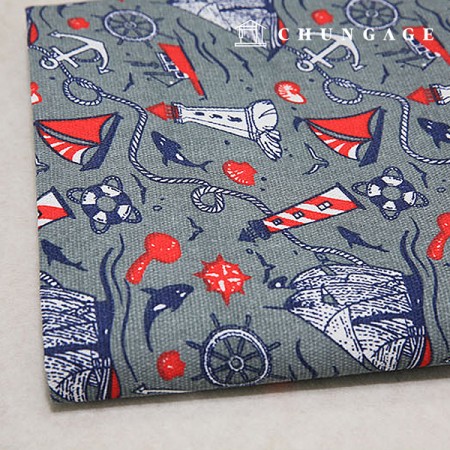 돌고래, 등대, 보트 등등의 마리나풍 프린트의 캔버스 원단이예요.