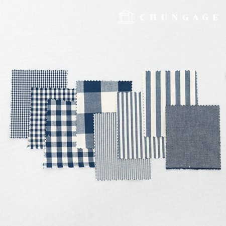 네이비 컬러 해지 무지 원단과 스트라이프, 체크 패턴을 다양하게 만나보실 수 있는 20수 선염 원단 8종입니다.